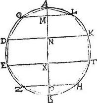 Intra circulum AB, cuius diameter AB, describatur polygonium aequalium laterum, ut puta decagonum AGDEZBHTKL, et ducantur GL,DK,ET,ZH, quae etiam ad rectos angulos secabunt diametrum AB in punctis M, N, X, O; circumvolvatur autem dimidium polygonii utrumlibet, ut puta dimidium ADB stante diametro AB completa revolutione, qua circumductione ipsum polygonii dimidium describet quodam solidum tornatile ADB compositum ex diversis, solidis, scilicet ex conis, quos describunt triangula AGM, BZO, ex conis-coluris, quos describunt trapezia MGDN, OZEX, et ex cylindro, quem describit rectangulum NDEX; describunt inquam in ipsa semipolygonii revolutione.