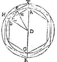 Quod si aequilaterae, et aequiangulae figurae rectilineae duo circuli unus circumscribatur, aliter inscribatur, et diametro manente tam semipolygonium, quam duo semicirculi circumducantur, descripti quoque a semipolygonio solidi superficies media proportionalis est inter sphaerarum a semicirculis descriptarum superficies. Descriptioni praecedentis addatur circulus THK circumscriptus figurae rectilineae THK, et sphaera per revolutionem semicirculi THK descripta. Aio iam quod solidi THK superficies media proportionalis est inter sphaerarum ABG, THK superficies. Nam per 10. ex recta HD, in peripheriam circuli THK fit dimidium superficiei sphaerae THK, atque, ut in praemissa, ostensum est, ex recta HD in peripheriam circuli ABG fit dimidium superficiei solidi THK. Quare per primam sexti superficies sphaerae THK ad superficiem solidi THK erit sicut peripheria circuli THK ad peripheriam circuli ABG et ideo per sextam sicut semidiameter DH ad semidiametrum DE: sed fuit in praemissa, sicut DH ad ipsam DE; sic superficies solidi THK ad superficiem sphaerae ABG: ergo et sicut superficies solidi THK ad superficiem sphaerae ABG sic superficies sphaerae THK ad superficiem solidi THK. Itaque superficies solidi THK media proportionalis est inter sphaerarum THK, ABG superficies; quod erat demonstrandum. COROLLARIUM.