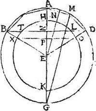 Sit deinde quod ex AG diametro in peripheriam circuli, cuius diameter AZ aequalis sphaericae superficiei maiori superficie sphaerica segmenti BAD; sed brevitatis causa sit suppositum segmentum THL. Aio quod id, quod ex HK diametro in peripheriam circuli, cuius diameter HZ non est aequale alicuius segmenti sphaericae superficiei maiori superficie segmenti THL sphaerici. Sit enim, si possibile est, aequale superficiei sphaericae segmenti BAD maiori superficie THL abscissi per planum circuli secantis sphaeram BD de sphaera ABGD, quam describit semicirculus ABG super diametrum AG, et secentur arcus AB, AD per 13.12. donec portionum chordae non contingant arcum THL; sitque ex chordis una AM, et connectatur GM, et ducatur ad AM perpendicularis EN, et quoniam AG dupla ipsius AE; ideo, et GM dupla ipsius EN, sed HK dupla ipsius HE minoris ipsa EN: minor ergo HK quam GM. Quare quod fit ex GM in peripheriam circuli, cuius diameter HZ maius est eo, quod fit ex HK in peripheriam circuli, cuius diameter HZ, sed quod fit ex GM in peripheriam circuli, cuius diameter AZ per praecedentem, aequale est superficiebus conicis descriptis a chordis arcuum, in quos secatur arcus AB: quod autem fit ex HK in peripheriam circuli, cuius diameter HZ per hypothesim aequale est superficiei sphaericae segmenti BAD: ergo superficies conicae descriptae a chordis portionum arcus AB maius sunt superficie sphaerica segmenti BAD. Superficies itaque inclusa maior includente, quod est impossibile: non est ergo, quod ex HK in peripheriam circuli, cuius diameter HZ aequale superficiei sphaericae segmenti alicuius maiori superficie sphaerica segmenti THL. Similiter ostendam quod id, quod ex AG in peripheriam circuli, cuius diameter AZ non est aequale alicuius segmenti sphaericae superficiei maiori superficie sphaerica segmenti BAD: fuitque ostensum, quod nec minori: omnino igitur id, quod fit ex AG in peripheriam circuli, cuius diameter AZ aequale est segmenti BAD sphaericae superficiei: quod erat demonstrandum. Suppo[S:59]suimus autem segmentum sphaericum BAD minus emisphaerio. Et similiter ostendi poterit quod id, quod fit ex AG in peripheriam circuli, cuius diameter GZ aequale est sphaericae superficiei segmenti BGD: vel si lubet pro linea BZ ducatur linea BE, et pro ZD linea ED secantes peripheriam circuli HTK apud puncta XO; et agatur demonstratio per segmenta sphaerica descripta per arcus BG, XK similes et per superficies conicas descriptas a chordis portionum arcus BG non tangentibus peripheriam XK: in secunda autem parte demonstrationis ducatur XO secans ipsam EZ apud P, eritque GZ axis segmenti BGD maior quam KP axis segmenti XKO, quod est necessarium in secunda parte demonstrationis: unde concludens eodem modo quo prius id, quod fit ex AG in peripheriam circuli, cuius diameter GZ esse maius omni superficie sphaerica segmenti descripti per arcum minorem ipso BG, et ei similem, et minus omni sphaerica superficie segmenti descripti per arcum maiorem ipso BG, et ei similem, et ideo aequalem esse sphaericae superficiei segmenti ab arcu BG descripti. Verum postquam ostenderis hoc de uno segmentorum sphaericorum, potest ex hoc idem facilius ostendi de reliquo, sic. Quoniam ostensum est quod id, quod fit ex AG in peripheriam circuli, cuius AZ est diameter aequum superficiei sphaericae segmenti BAD: ex hoc ego ostendam quod id, quod fit ex AG in peripheriam circuli, cuius diameter GZ aequum erit superficiei sphaericae segmenti BGD: nam per 10 huius. Superficies tota sphaerae ABG, quod est aggregatum ex superficiebus sphaericis duorum segmentorum BAD, BGD aequalis est ei, quod fit ex AG in peripheriam circuli ABG: sed peripheria circuli ABG per primum corollarium sextae aequalis est peripheriis circulorum, quorum diametri AZ, ZG, coniunctis: ergo aggregatum ex superficiebus sphaericis segmentorum BAD, BDG aequale est ei, quod fit ex AG in peripherias circulorum, quorum diametri AZ, ZG. Auferatur inde segmenti BAD sphaerica superficies: hinc vero quod fit ex AG in peripheriam circuli, cuius diameter AZ, quae, ut fuit ostensum, sunt aequalia; et supererit segmenti BDG superficies sphaerica aequalis ei, quod fit ex AG in peripheriam circuli, cuius diameter ZG: et hoc erat propositum.