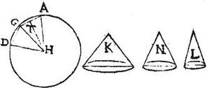 Si circuli arcus quispiam in portiones secetur aequales, quibus chordae subtendantur, et arcus extrema, cum centro circuli connectantur: rectilineum autem sub chordis, et semidiametris comprehensum, altera semidiametrorum stante, semel circumducatur: descriptum solidum aequum est ei cono, cuius basis aequalis est conicis superficiebus per chordas descriptis, celsitudo vero aequalis perpendiculari, quae a centro circuli ad quamlibet chordarum egreditur.